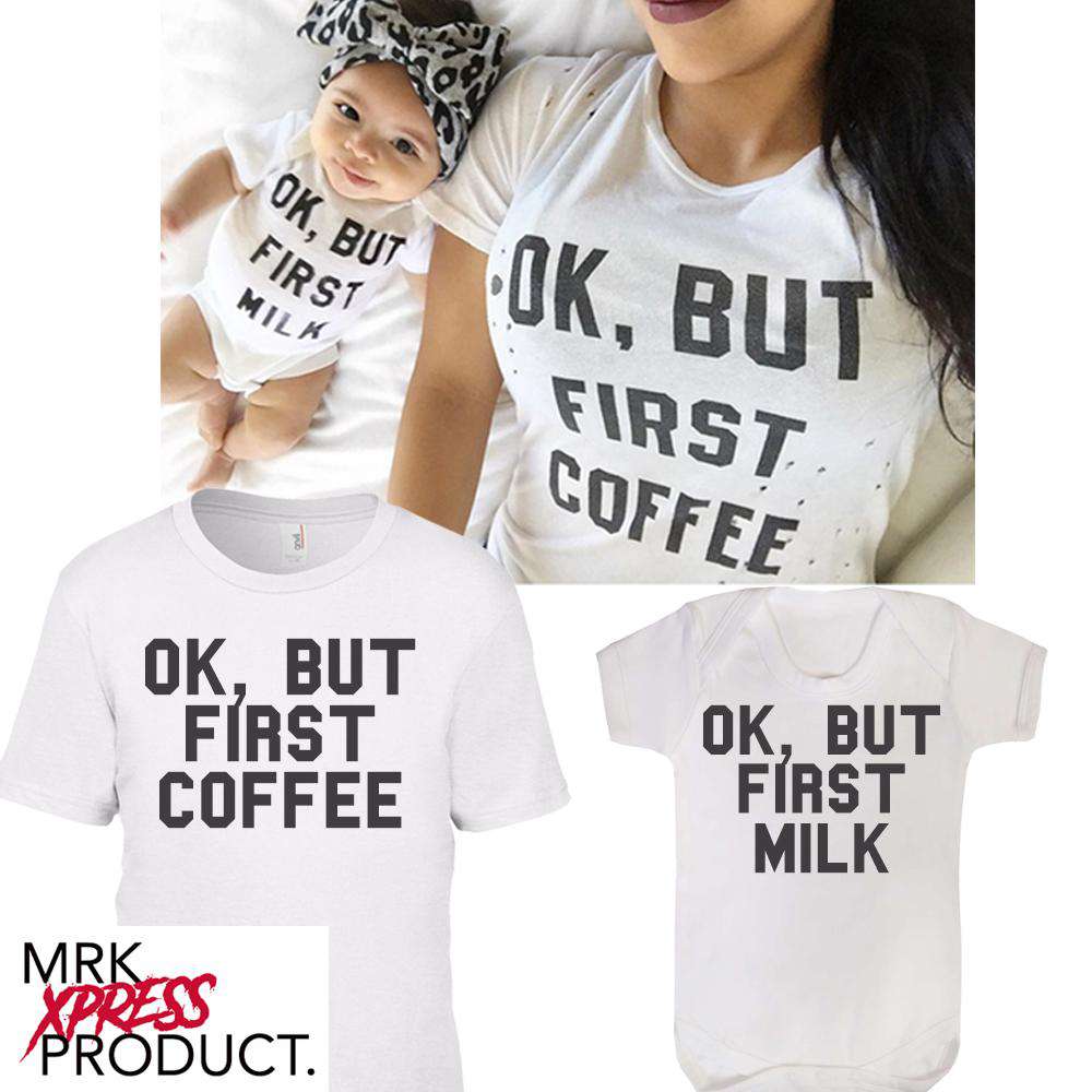 BUT FIRST COFFEE/MILK. Matching Tee & Bodysuits - White - (MRK X)