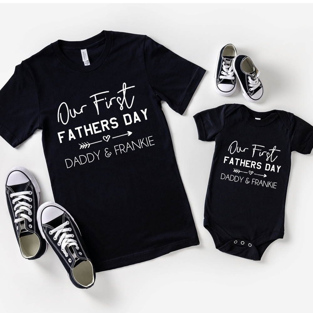 The cutest matching outfits for Daddy and mini on their first Fathers Day! Featuring a graphic 'Our First Fathers Day Slogan'.